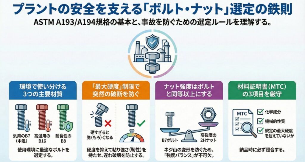 ボルトの真の役割は、部品を固定するだけでなく、「軸力(じくりょく)」によってフランジ同士を強く押し付け、気密を保持することにあります。もし材質の選定を誤れば、運転中にボルトが破断し、大規模な漏洩事故に繋がる恐れがあります。本日は、業界の標準である「ASTM A193」と「ASTM A194」を中心に、材質選定の要点を解説いたします。