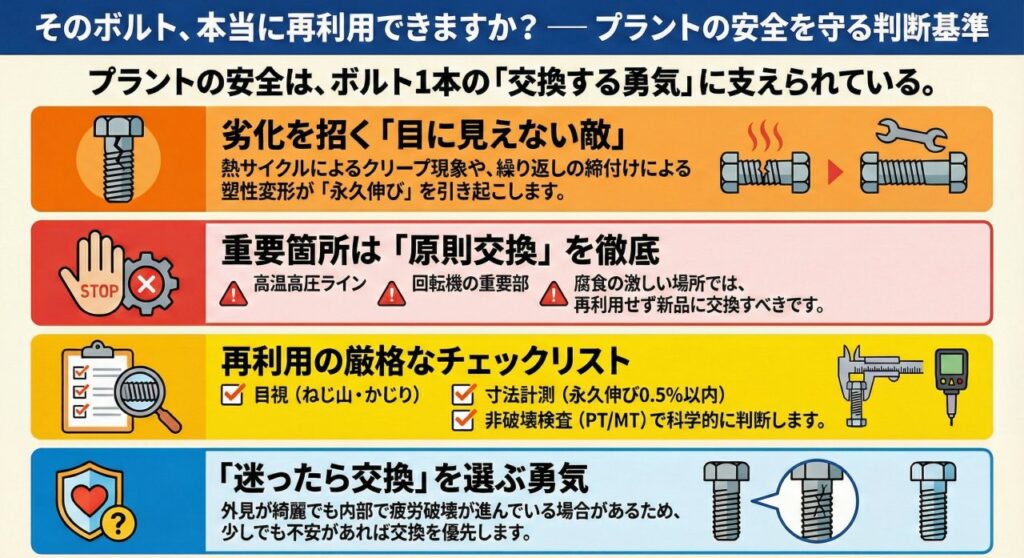 まず覚えておいてほしいのは、高温高圧ラインや、振動の激しい回転機の重要部、そして腐食が激しい場所のボルトは「原則交換」です。