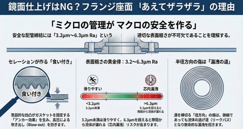 しかし、実はその「鏡面仕上げ(ミラーフィニッシュ)」こそが、プラントにおいては漏洩の引き金になることがあるのです。なぜ、あえて凹凸を作る必要があるのか。その奥深い世界を紐解いていきましょう。