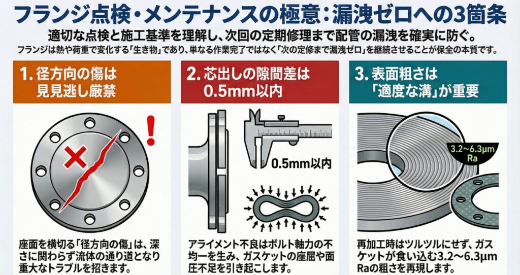 隙間腐食や外面からの腐食によって、本来のシール幅が減少しているケースも多々あります。私たちの「現場運用マニュアル(Engineering Manual)」では、有効シール幅が一定割合以上損なわれている場合、そのフランジは「殺し(交換または再加工)」と判断します。見た目の綺麗さに騙されず、有効な「面」がどれだけ残っているかをシビアに評価してください。