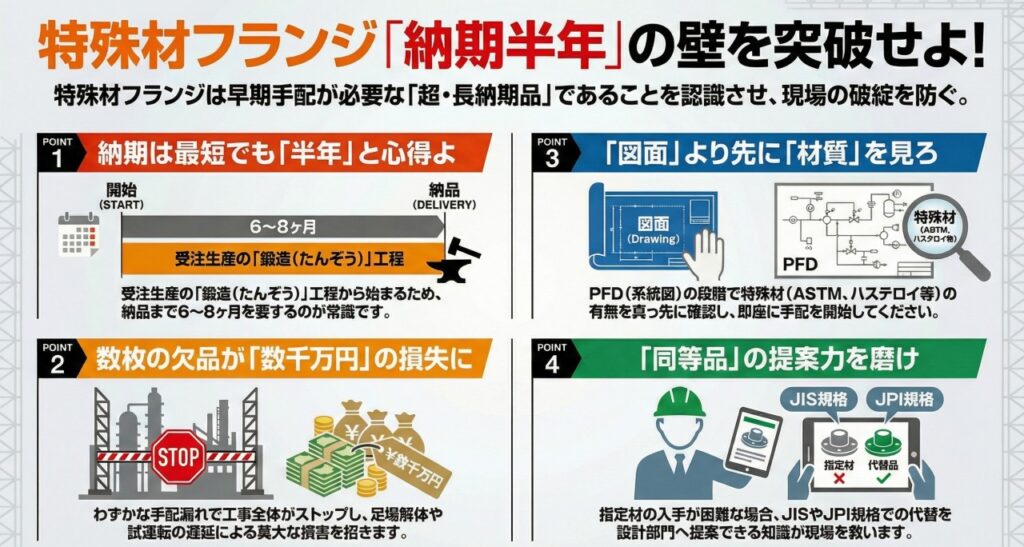 これらを積み上げると、発注から納品まで6ヶ月、場合によっては8ヶ月かかることもザラにあります。つまり、特殊材フランジは、大型機器と同じ「ロングリードアイテム(長納期品)」として扱わなければならないのです。