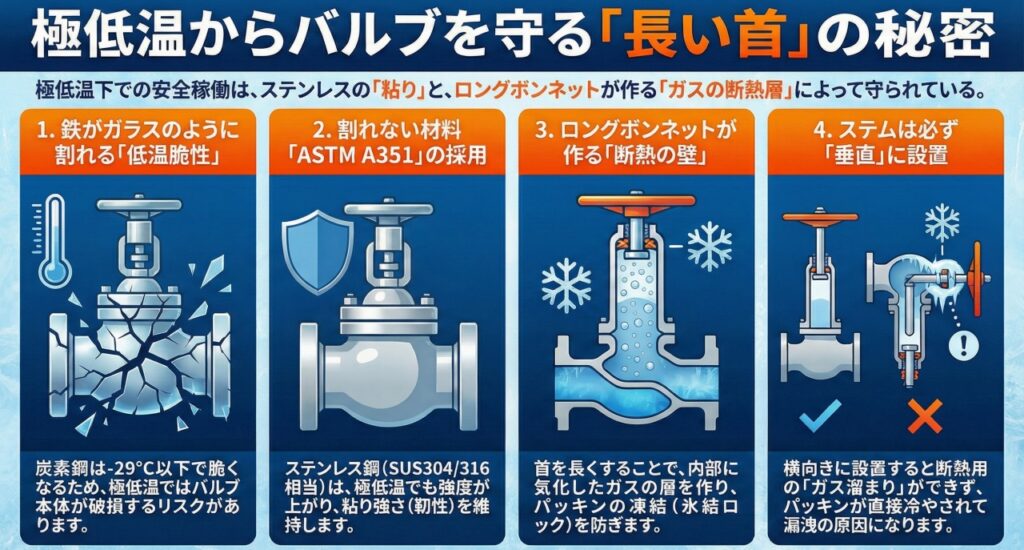 もし普通の長さだと、-196℃の冷熱が金属を伝わってパッキン部まで到達し、パッキンをカチコチに凍らせてしまいます。こうなるとシール機能が失われて漏れるだけでなく、水分が凍結してハンドルが回らなくなる「氷結ロック」が発生します。