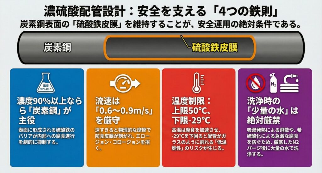 濃硫酸配管において、設計者が最も神経を使うべきパラメータは「流速」です。 先ほど説明した通り、炭素鋼の耐食性は表面の「硫酸鉄(FeSO4)皮膜」に依存しています。この皮膜は非常に脆弱で、物理的な力に弱いという欠点があります。