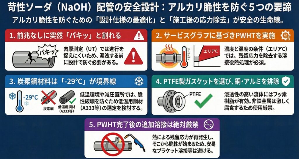 例えば、濃度50%の苛性ソーダを扱う場合、温度が70℃を超えるあたりからエリアCに入り、PWHTが義務付けられます。設計担当者は、プロセスの常用温度だけでなく、スチームトレースによる過熱や、洗浄時の温度上昇なども考慮し、最悪のシナリオを想定してPWHTの要否を判断しなければなりません。迷った場合はPWHTを実施する側へ倒すのが、長期的な保全コストを抑える賢明な判断です。