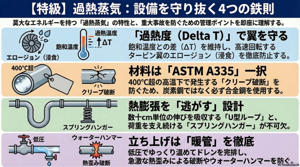 過熱蒸気を扱うということは、自然界の物理法則と真っ向から向き合うということです。温度、圧力、材料特性、そして熱力学。これら全ての要素が論理的に組み合わさって、初めて巨大なタービンは安定して回り続けます。