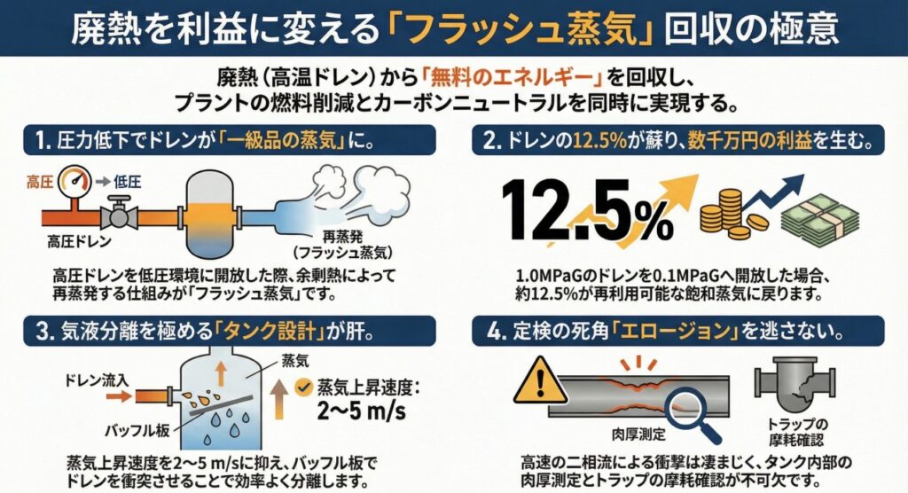 フラッシュ蒸気を有効活用するためには、ドレンと蒸気を確実に分離する「フラッシュタンク(気液分離器)」の設計が肝要です。