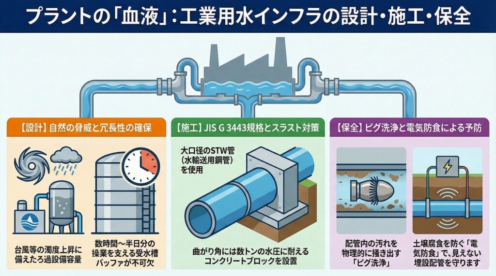 本記事では、河川や広域水道を水源とする取水・ろ過プロセスの設計思想と、JIS G 3443に基づく大口径配管の施工管理を詳述します。